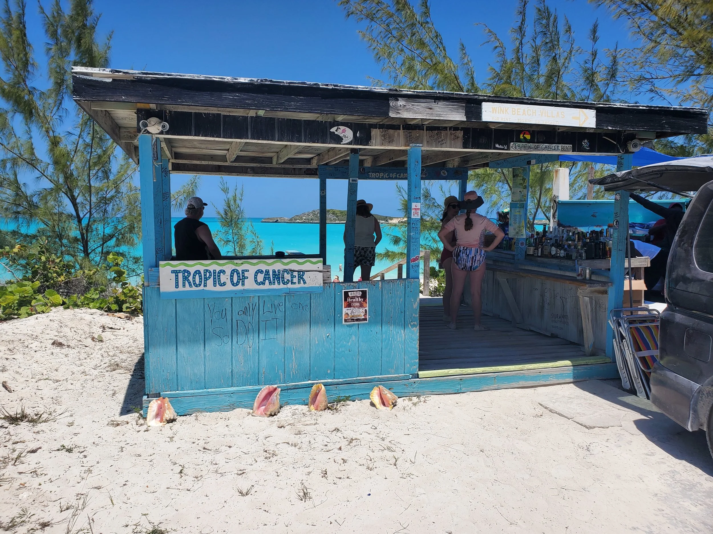 Next, enjoy a beach day at Tropic of Cancer Beach, about 30 min south of George Town. Supposedly the Tropic of Cancer runs right through the beach BUT, with the earth’s tilt changing over time, it may be off by just a little bit. Either way, wear your sunscreen! And enjoy this beautiful white sand beach and stunning turquoise water. Shade is minimal (you’ll have to tuck yourself up under some small shrubs to find it), so bring an umbrella if you’ve got one handy. When we were there, Brea’s Delights Seaside Bar was operating right at the top of the set of stairs down to the beach. Also just a few miles away, are 2 restaurants highly recommended on Trip Advisor - Tropic Breeze or Santannas. We ended up at the latter for a late afternoon fried food snack and a few drinks.
